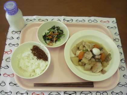 ごはん・牛乳・かつおふりかけ・春野菜のうま煮・ほうれん草のりあえ です。