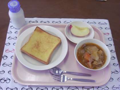 今日の献立は、 フレンチトースト・牛乳・ボルシチ・果物(りんご) です。