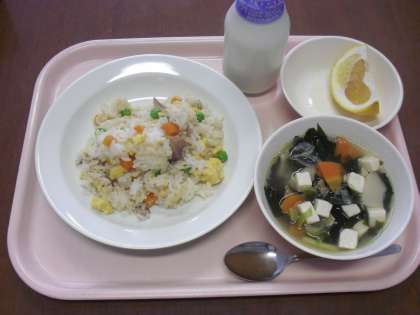 チャーハン、わかめスープ、牛乳、果物(美生柑)です。