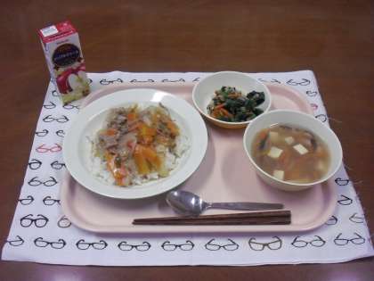 スタミナ丼・りんごジュース・春雨スープ・青菜のりあえ です。