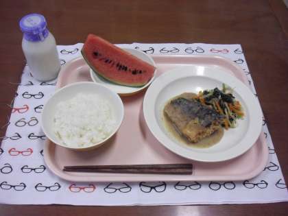 ごはん・牛乳・魚のごまだれかけ・おひたし・果物(小玉スイカ) です。