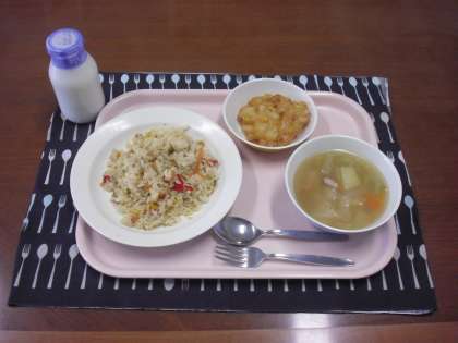 ナシゴレン・牛乳・キャベツスープ・大豆とコーンのフリッター です。