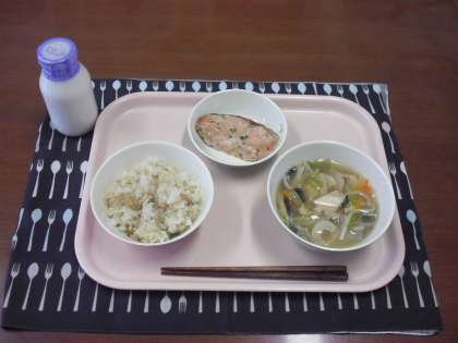 豆ごはん・牛乳・魚のガーリック焼き・あんかけ汁 です。