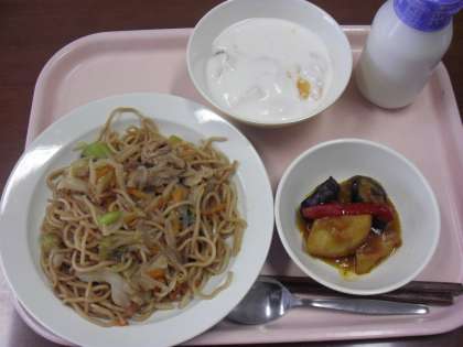 五目焼きそば・牛乳・夏野菜の南蛮かけ・フルーツヨーグルト です。