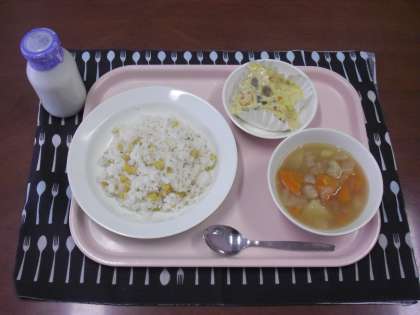 コーンライス・牛乳・スペイン風卵蒸し・白いんげんの田舎スープ です。