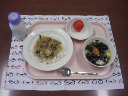豚キムチ丼・牛乳・わかめスープ・果物(プラム) です。