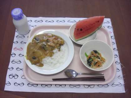 今日の献立は、 夏野菜のカレーライス・牛乳・ナムル・果物(すいか) です。