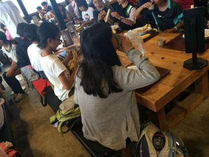 江戸村の食事処お狩場で、カレーライスを食べています。