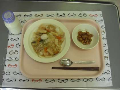 今日の献立は、 中華丼・牛乳・大豆とじゃこの甘辛揚げ です。