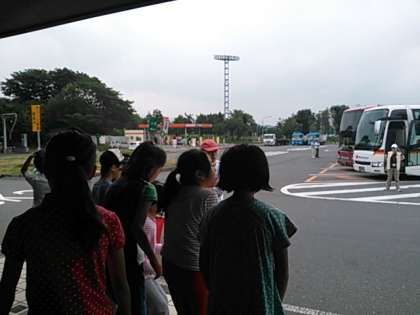 子どもたちはバスの中で、怖い話をしたり、特技を披露したりしています。