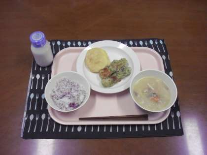 ゆかりごはん・牛乳・天ぷら(ちくわ・じゃがいも)・呉汁 です。