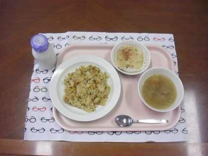 メキシカンライス・牛乳・ポテトのクリーム焼き・コンソメスープ です。