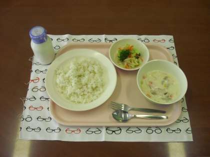 じゃこライス・牛乳・マカロニのクリーム煮・ブロッコリーのサラダ です。