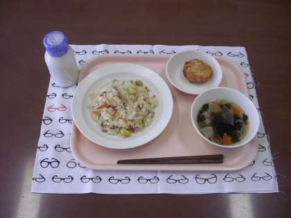 秋の香りごはん・牛乳・豆腐のナゲット・すまし汁 です。