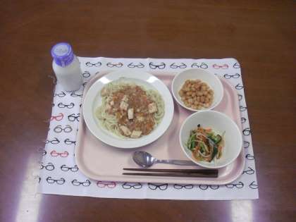 マーボー豆腐焼きそば・牛乳・野菜のしょうがじょうゆかけ・きなこビーンズ