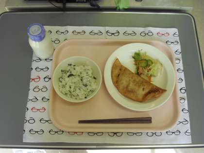 わかめごはん・牛乳・ジャンボぎょうざ・白菜の中華サラダ です。