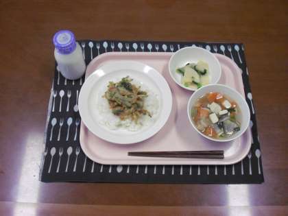 かき揚げ丼・牛乳・豆腐汁・かぶのレモンじょうゆかけ です。