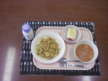 カレーピラフ・牛乳・ビーンズシチュー・果物(りんご) です。