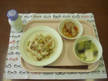 吹き寄せごはん・牛乳・大豆と手羽のやわらか煮・みそ汁 です。