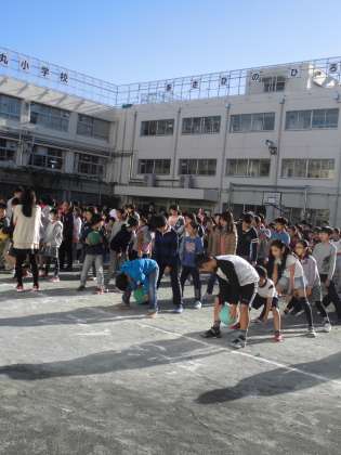 学年関係なく並んでいるので、身長差もありましたが、高学年の児童がかがんで、後ろにいる低学年の児童にボールをパスする姿も見られました。