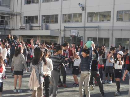 今日は、校庭でたてわり班対抗のボール送りゲームを行いました。