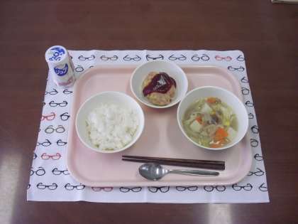 ごはん・ジョア・アップルチーズハンバーグ・ベーコンと野菜のスープ煮 です。