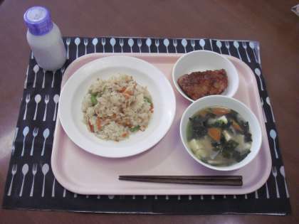 子ぎつねごはん・牛乳・魚のカリント揚げ・わかめスープ です。