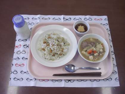 豆ごはん・牛乳・いわしのつみれ汁・黒蜜寒天 です。