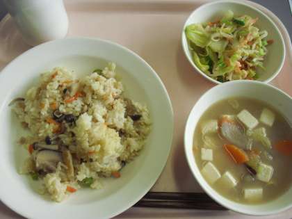 きのこごはん、牛乳、さつま汁、野菜のごま酢あえ です。