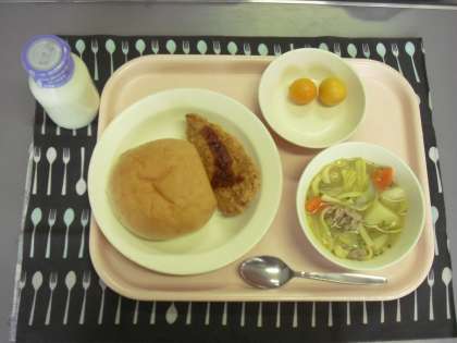 セルフフィッシュサンド・牛乳・ヌードルスープ・果物(きんかん) です。