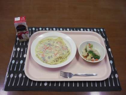 スパゲティークリームソース・りんごジュース・花野菜サラダ です。