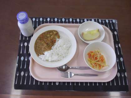 ひよこ豆のカレーライス・牛乳・にんじんサラダ・果物(りんご) です。
