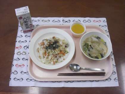 給食では、昆布を入れて炊いたご飯に寿司酢を加え、ごぼうやかんぴょう、椎茸などを煮たもの、酢れんこん、角切りして揚げた鮭、さやえんどう、生姜漬けなど具だくさんの豪華な五目寿司、手作り肉団子を入れ、野菜を種類も量もたっぷり使ったあんかけ汁、黄桃缶を使ったピーチゼリーにしました。今日の献立もどれも手間ひまかかっています。