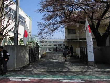 元気いっぱいで桜の木の下の校門を通り、新1年生が登校してきました。