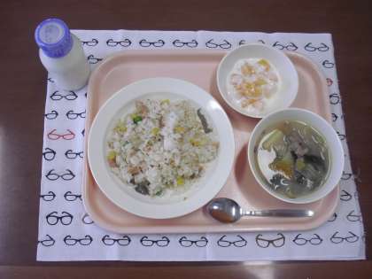 鮭ピラフ・牛乳・ベーコンと野菜のスープ煮・フルーツヨーグルト です。