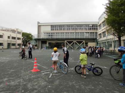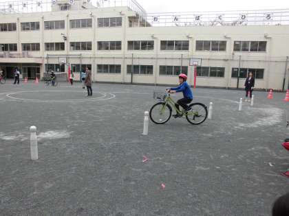 校庭にミニ道路をつくっていただき、子どもたちは一人一人自転車に乗って走りました。