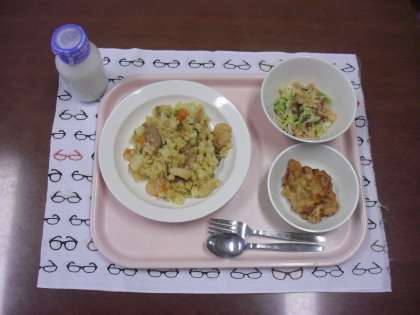 パエリア・牛乳・大豆とコーンのフリッター・シーザースサラダ です。