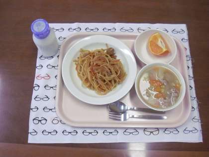 スパゲティーナポリタン・牛乳・田舎風スープ・果物(セミノール) です。