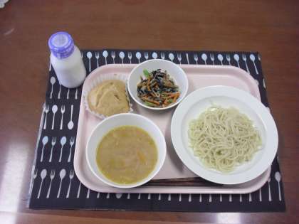 中丸ラーメン・牛乳・青菜ののりあえ・黒砂糖入り蒸しパン です。