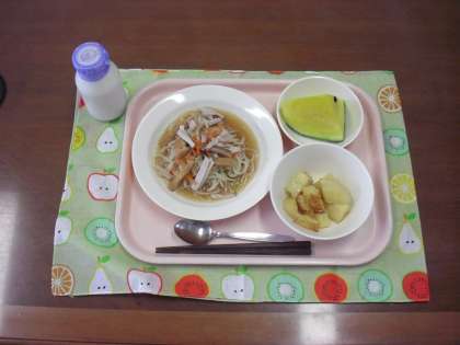 今日は一気に夏を連想させる献立です。でも、給食室では冷やし中華作りには、麺にかけるつゆを朝一番に作り(作りの中には、だしをとり、材料を切るなどのさまざまな工程が含まれます)冷やす、次に麺や野菜をゆでて水で冷やすといった、暑さの中で調理を行っているのです。みんなに冷たく、且つおいしく食べてもらうためです。