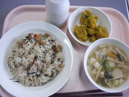 五目ごはん、牛乳、吉野汁、かぼちゃの含め煮 です。