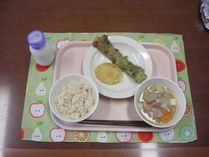 新しょうがごはん・牛乳・天ぷら(じゃがいも・ちくわ磯部)・豚汁 です。