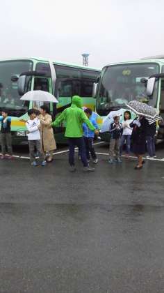 あいにくの雨模様ですが、予定どおり学校を出発しました。