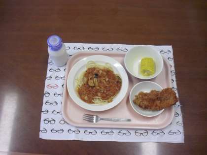 スパゲティーなすミートソース・牛乳・魚のフライ・蒸しとうもろこし