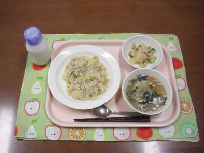 青菜のチャーハン・牛乳・ワンタンスープ・ビーンズサラダ です。