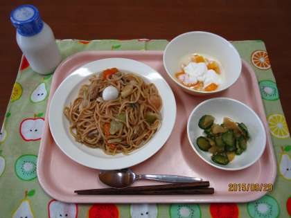 五目焼きそば・牛乳・きゅうりの中華味・フルーツヨーグルト です。