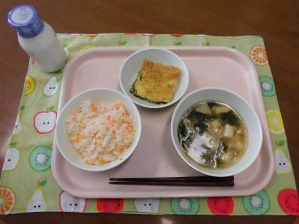 にんじんごはん・牛乳・もずく入り卵焼き・豆腐汁 です。