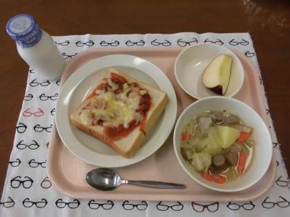 ピザトースト・牛乳・ポトフ・果物(りんご) です。