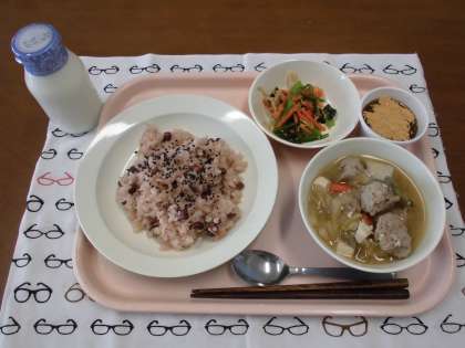 赤飯・牛乳・つみれ汁・ナムル・黒蜜寒天 です。