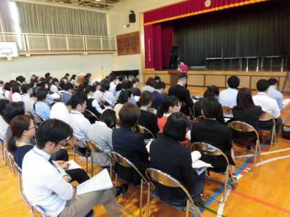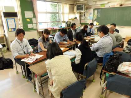 授業参観後は、国語、社会、算数・数学、理科、体育・保健体育、外国語・英語・日本語、芸術・技術・家庭の7つの教育部会に分かれて授業改善に向けての話し合いがもたれ、全体会で報告し合いました。